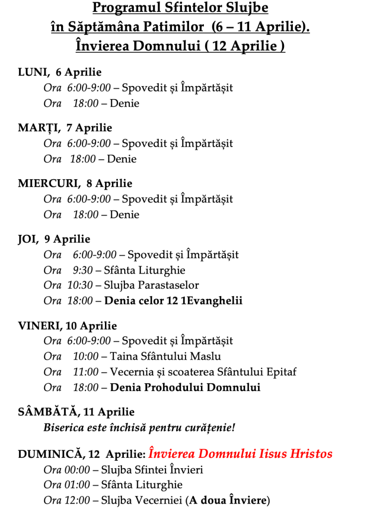 Programul pentru Spovedit și Împărtășit în Săptămâna Patimilor este următorul: